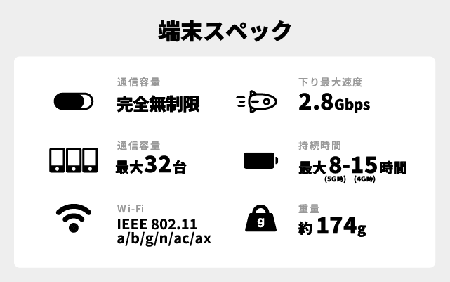 | バッテリー持続時間 | 5G:最大8時間 / 4G:最大15時間 ※上記は理論値です。ネットワーク環境等により、異なる場合があります。 |