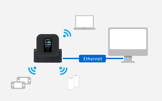 モバイルWiFiルータ(FS030W)に、FS030W専用クレードルを接続すると、高速で安定したインターネットをご利用いただけます。Wi-Fi非対応のデスクトップパソコンなどと有線LAN接続が可能となります。