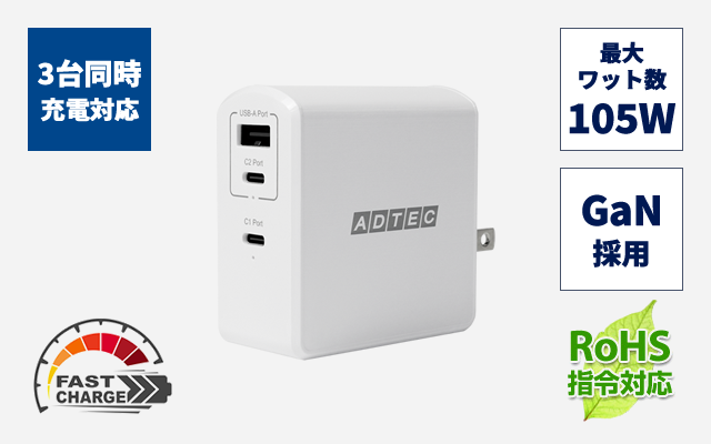 高効率・高耐久性を誇るGaN(窒化ガリウム)を採用、コンパクトなボディーに最大105W(合計)の高出力を実現。