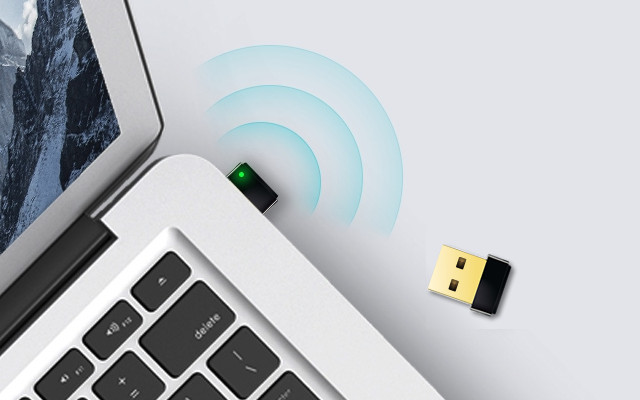 超小型Wi-Fi子機(USBアダプター)は、無線LAN(Wi-Fi)機能が備わっていないパソコンでも、パソコンのUSB端子に装着するだけで、かんたんに Wi-Fi が利用できるようになります。無線子機は超小型設計。パソコンに装着した時の「飛び出し」部分が少ないため、ノートPCなどに装着したままでも邪魔になりにくく、パソコン回りがスッキリします