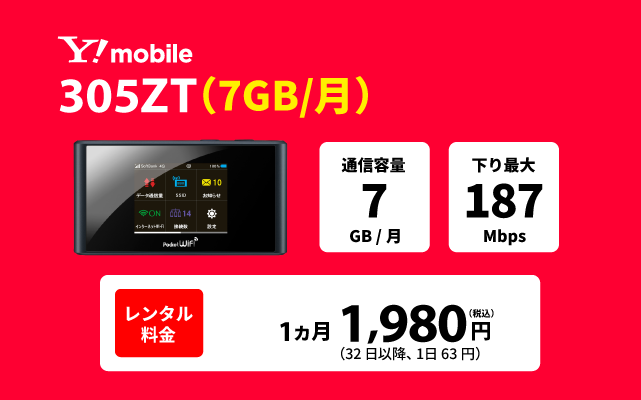 wifi レンタル 国内 Y!mobile 305ZT(7GB/月) モバイルWiFiルーター